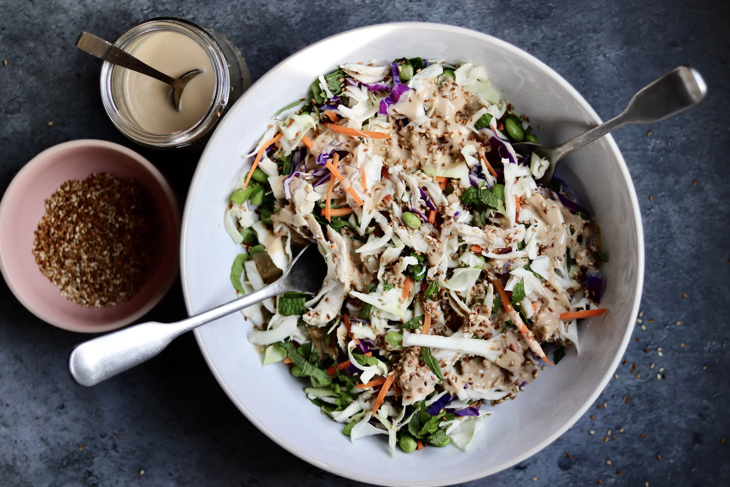 Why this is peri-perfect… This salad is proof that eating well doesn’t have to mean hours in the kitchen. A simple bag of coleslaw mix becomes the crunchy, colourful base - no chopping board required. Add in edamame and chicken (or tofu) for a steady hit of protein, and you’ve got a meal that keeps energy and blood sugar balanced through the afternoon. The high-protein peanut lime dressing is the real game-changer: creamy, zesty, and secretly boosted with protein powder to hit that 30g sweet spot. Quick to throw together, satisfying to eat, and designed to keep your hormones - and your busy day - steady. Perfect for a Summery dinner or lunchbox staple.