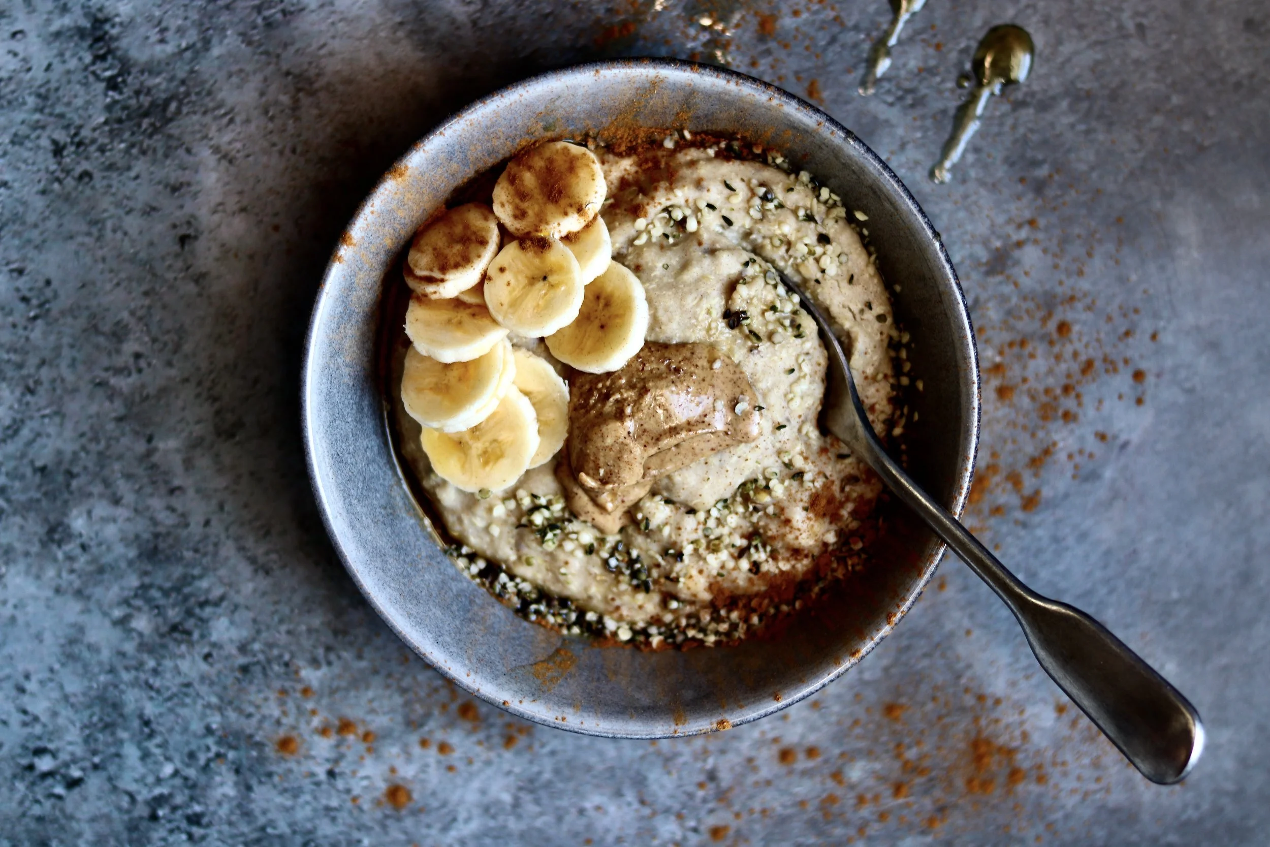 Spoon into a bowl. Add banana slices, almond butter, and hemp seeds or walnuts.