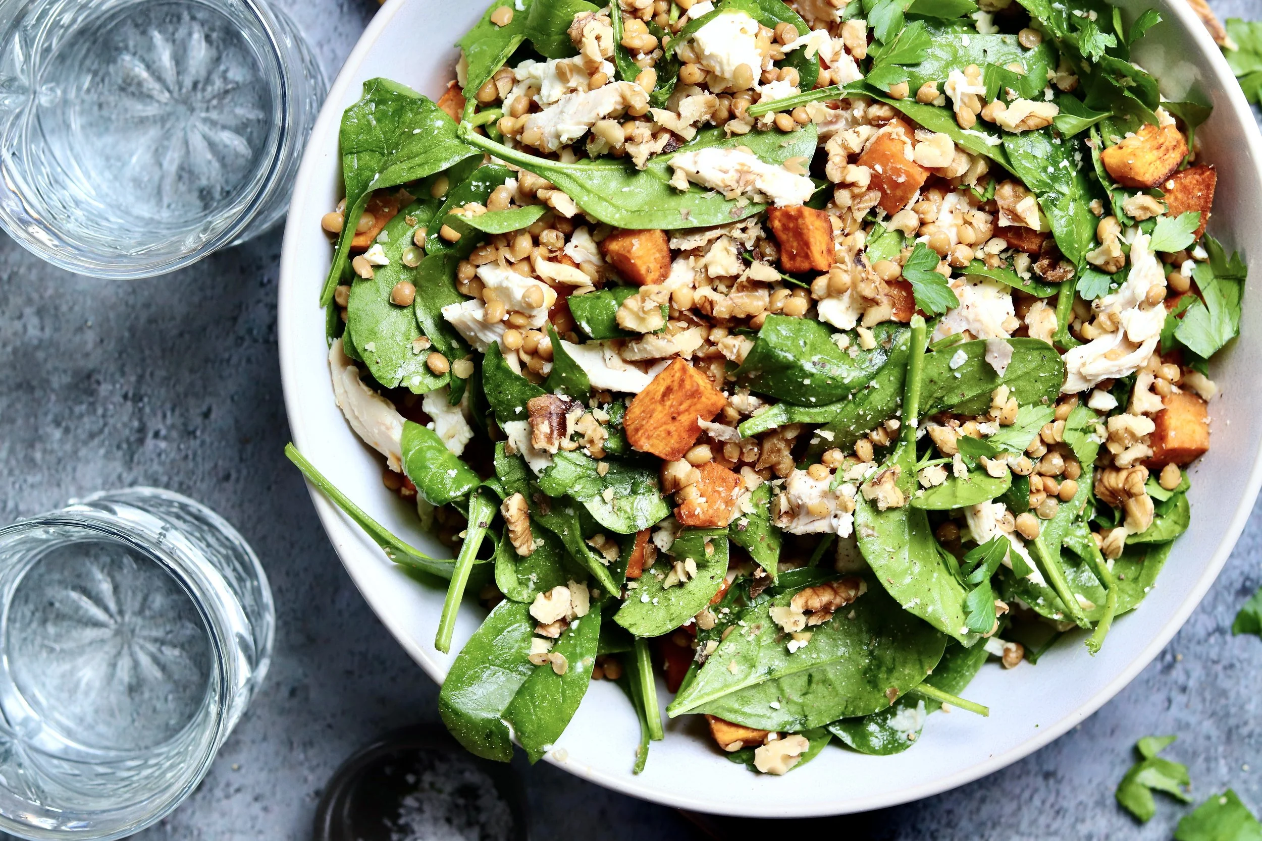 In a large bowl, combine: Lentils, Roasted sweet potato, Spinach or kale (massage kale with a few drops of lemon juice if using, Chicken or tofu, Crumbled feta, Toasted walnuts, Fresh herbs. Drizzle with dressing and toss gently to combine.