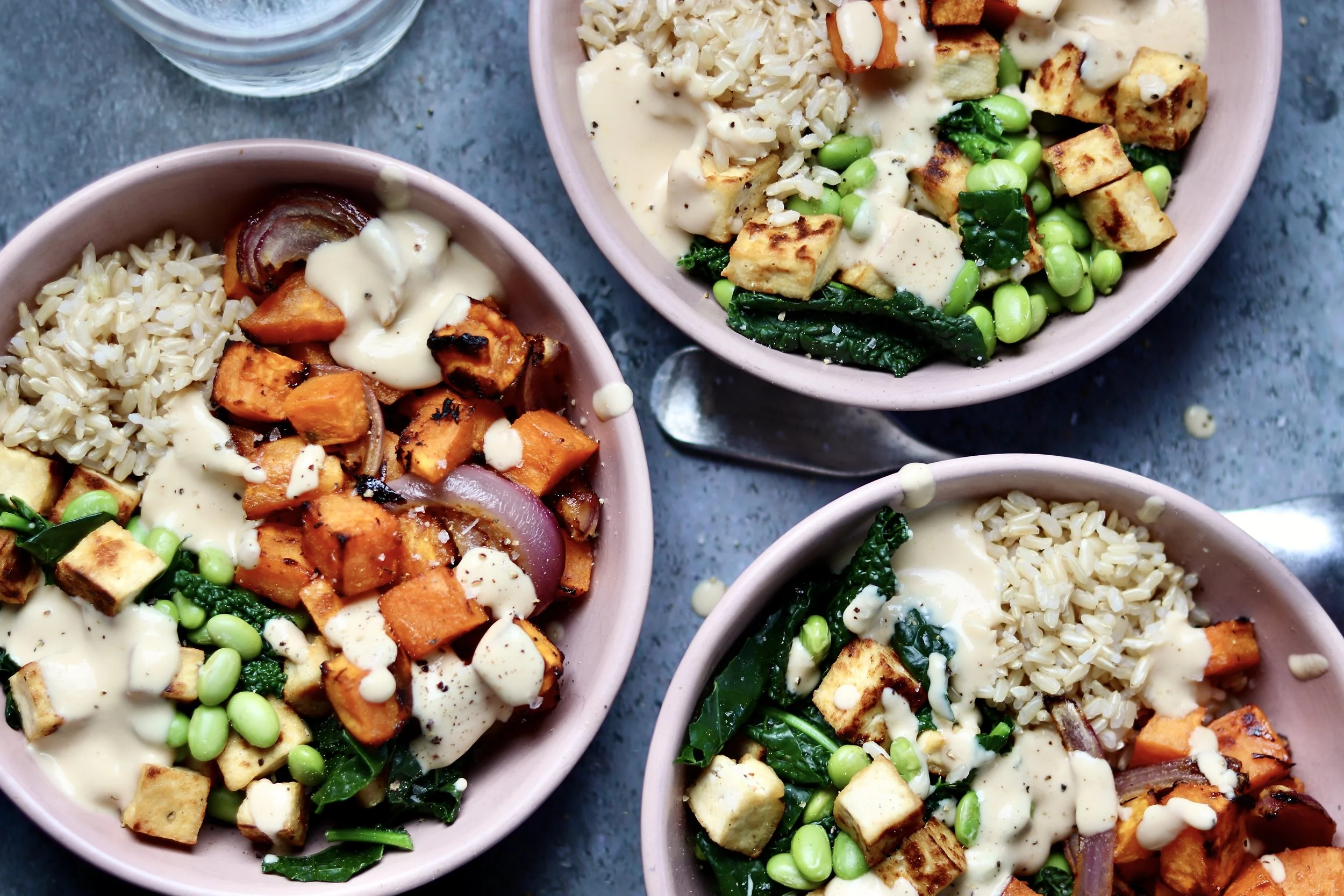 Miso Roasted Sweet Potato Bowls with High-Protein Miso Dressing.