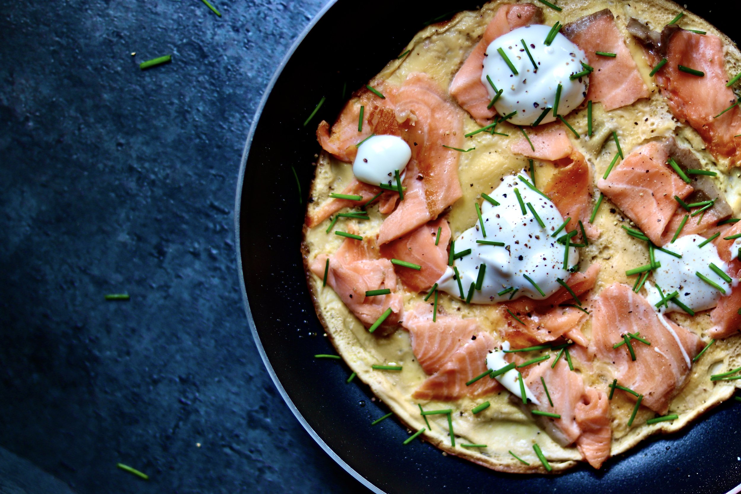 4. Once just set, add the smoked salmon, until the salmon is pale pink and the omelette is brown underneath.