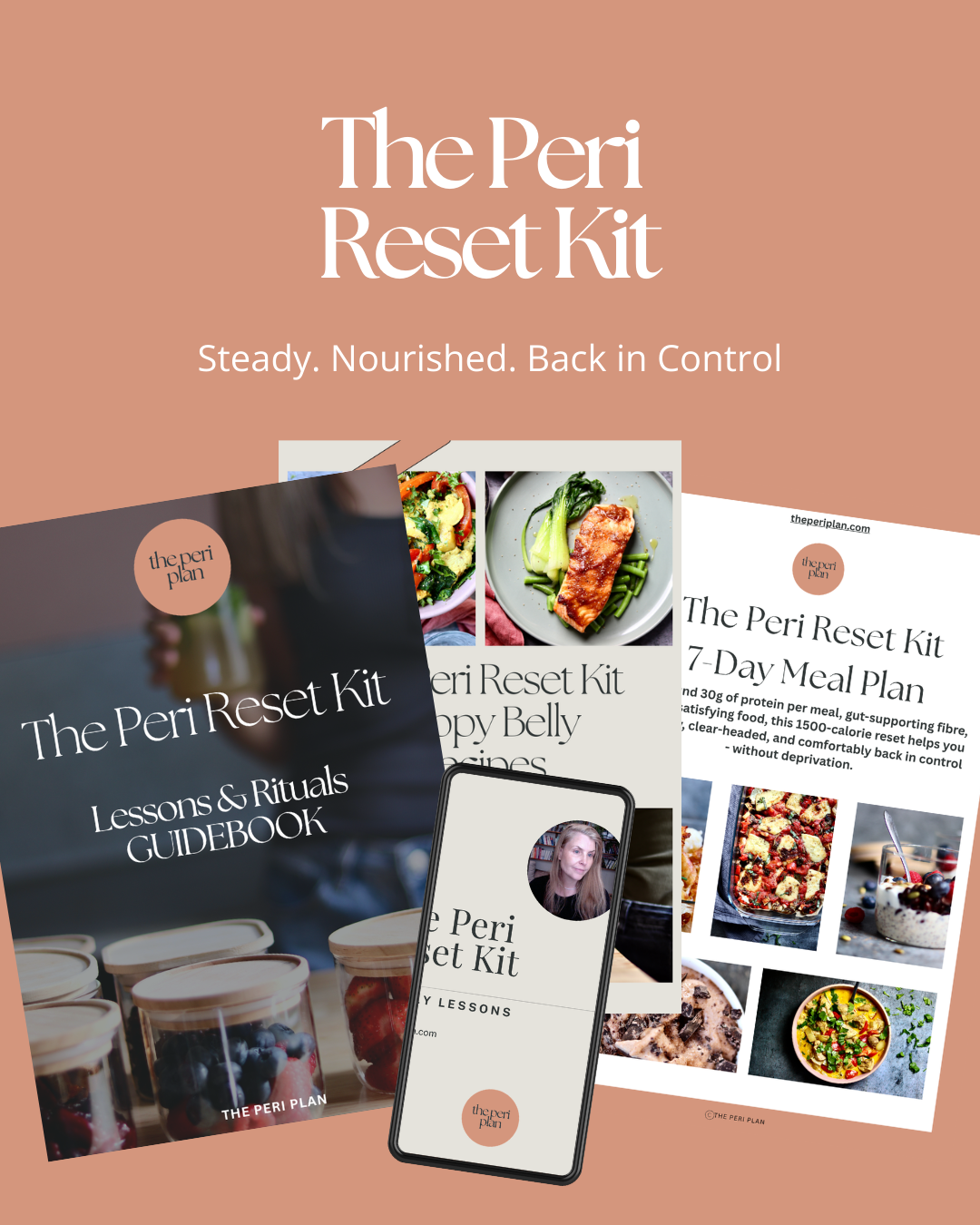 The Peri Reset Kit is a deliberately designed 7-day sequence that helps you begin nourishing your body, restoring rhythm, and building strength in midlife.